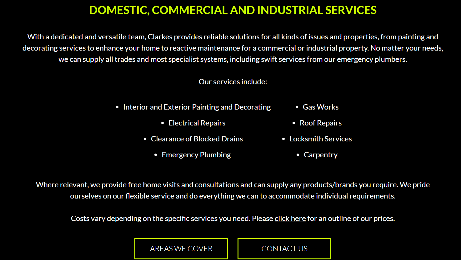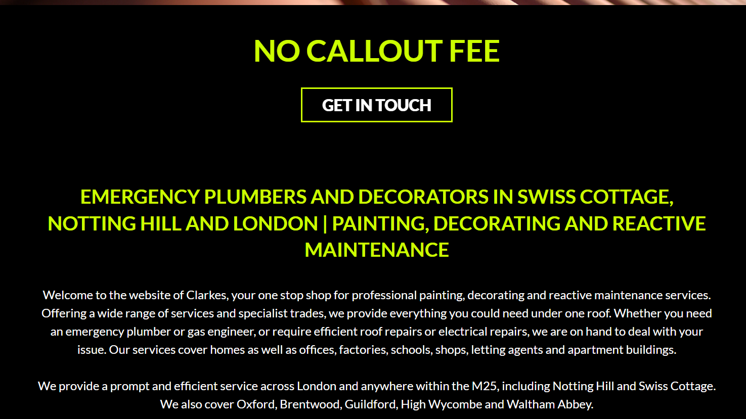Welcome to Clarkes, your one stop shop for professional painting, decorating and reactive maintenance services. Offering a wide range of services and specialist trades, we provide everything you could need under one roof. Whether you need an emergency plumber or gas engineer, or require efficient roof repairs or electrical repairs, we are on hand to deal with your issue. Our services cover homes as well as offices, factories, schools, shops, letting agents and apartment buildings. We provide a prompt and efficient service across London and anywhere within the M25, including Notting Hill and Swiss Cottage. We also cover Oxford, Brentwood, Guildford, High Wycombe and Waltham Abbey.